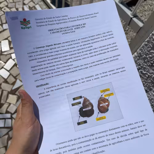 A Empresa de Pesquisa Agropecuária e Extensão Rural de Santa Catarina (Epagri), realizou visitas em residências nos bairros Cascata e Trinta Réis, em Nova Trento, para orientar os moradores sobre a presença de caramujos gigantes africanos.