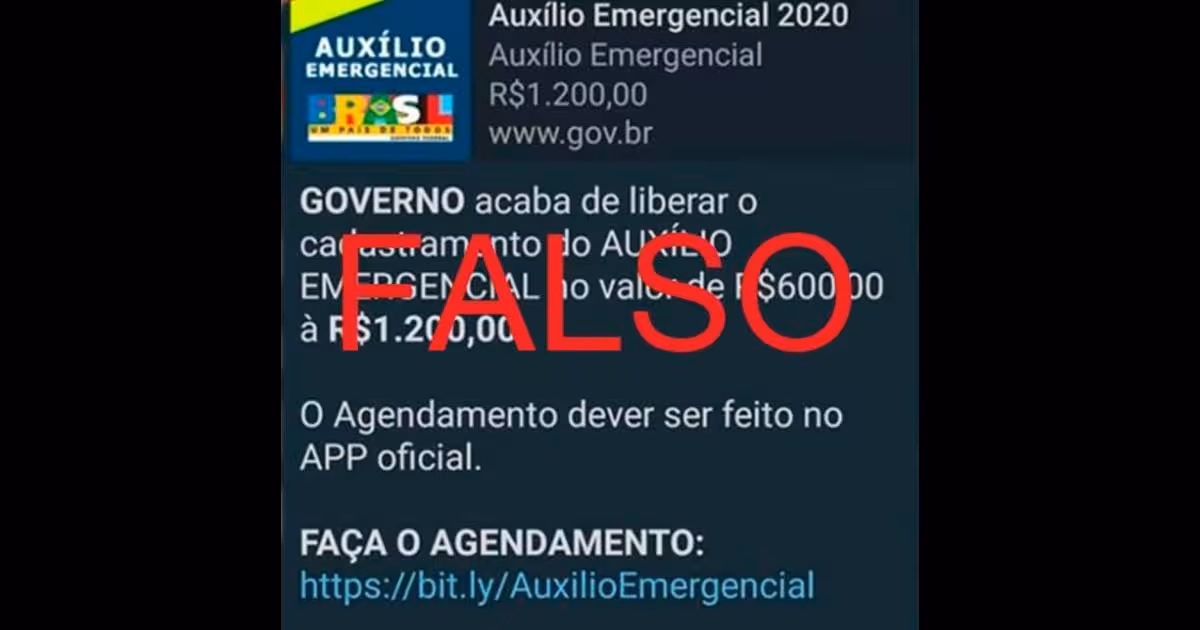 É falsa uma notícia que circula em grupos de WhastApp e em postagens de redes sociais sobre um site que estaria fazendo o cadastramento para "Auxílio Emergencial 2020", no valor de R$ 1.200, do governo federal.