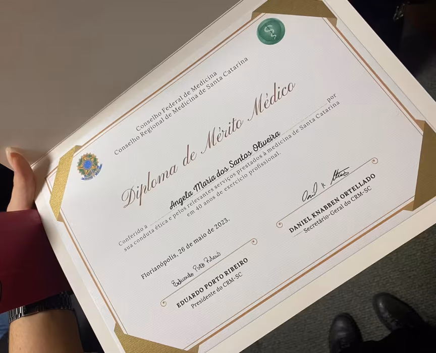 No ano passado, a pediatra foi reconhecida pelo CRM com o Diploma de Mérito Médico, que reconhece profissionais pela conduta ética e serviços prestados por mais de 40 anos.
