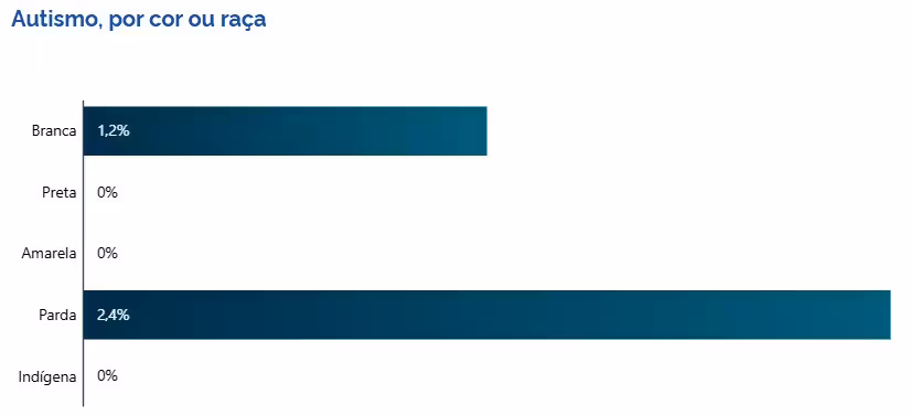 Em relação à cor e à raça, há apenas duas classificações: brancos e pardos. Conforme os dados do IBGE, a porcentagem de pessoas pardas com autismo no município, 2,4%, representa o dobro de pessoas brancas com o espectro, 1,2%.