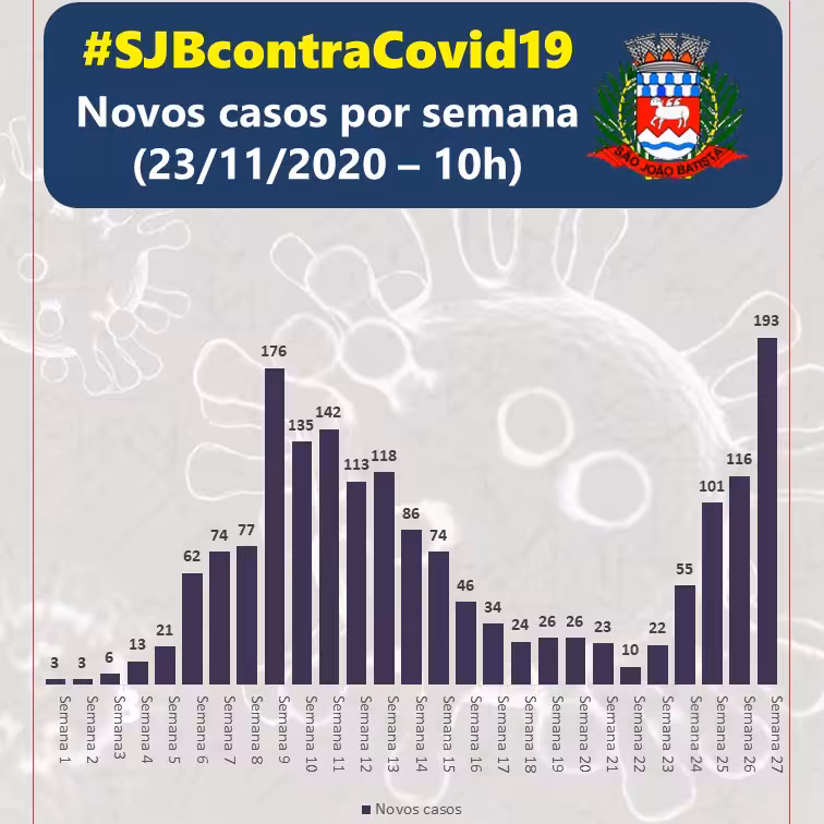 Na contagem semanal, a cidade registrou 193 novos casos de Covid-19 em São João Batista. O número é o maior registrado desde o início da pandemia.