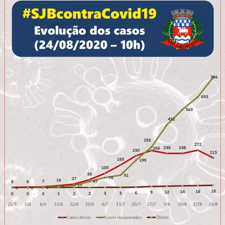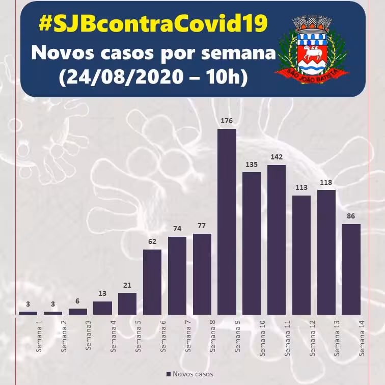 Em comparação com a semana anterior, São João Batista teve uma redução de 27,12% no número de novos casos confirmados de Covid-19 ao longo dos últimos sete dias. No mesmo período, foi registrado uma diminuição de 21,96% no número de casos ativos.