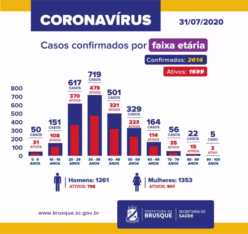 Em números absolutos, a maioria dos casos confirmados de coronavírus em Brusque é de mulheres. São 1353 casos (901 ativos), contra 1261 de homens (798 ativos). A faixa-etária de 30 a 39 anos é a que soma a maior quantidade de casos, tanto em número totais, quanto de ativos. São 719 e 479, respectivamente.