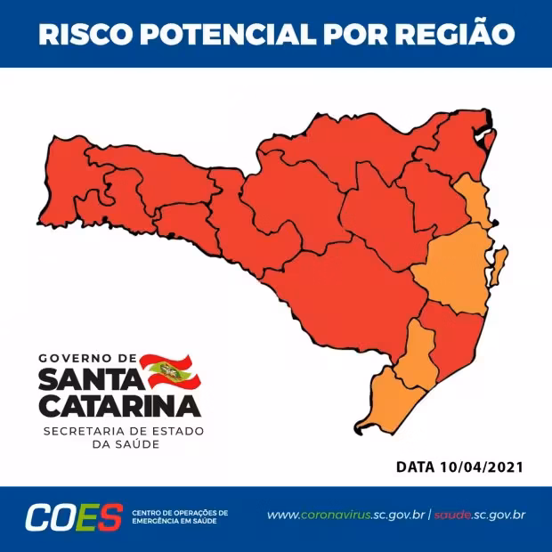 A Matriz de Risco Potencial divulgada neste sábado, 10, pelo Governo de Santa Catarina e Secretaria de Estado da Saúde (SES) classifica 12 das 16 regiões em alerta gravíssimo (cor vermelha) e quatro em risco grave (cor laranja) para transmissão do novo coronavírus.