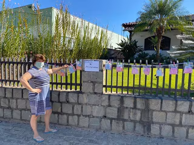A ideia de criar um varal e colocar as máscaras para que outros moradores pudessem buscar um item veio da neta. Foi colocada uma cordinha e pacotinhos de máscaras, cada um com três itens, além de uma placa sinalizando a doação.
