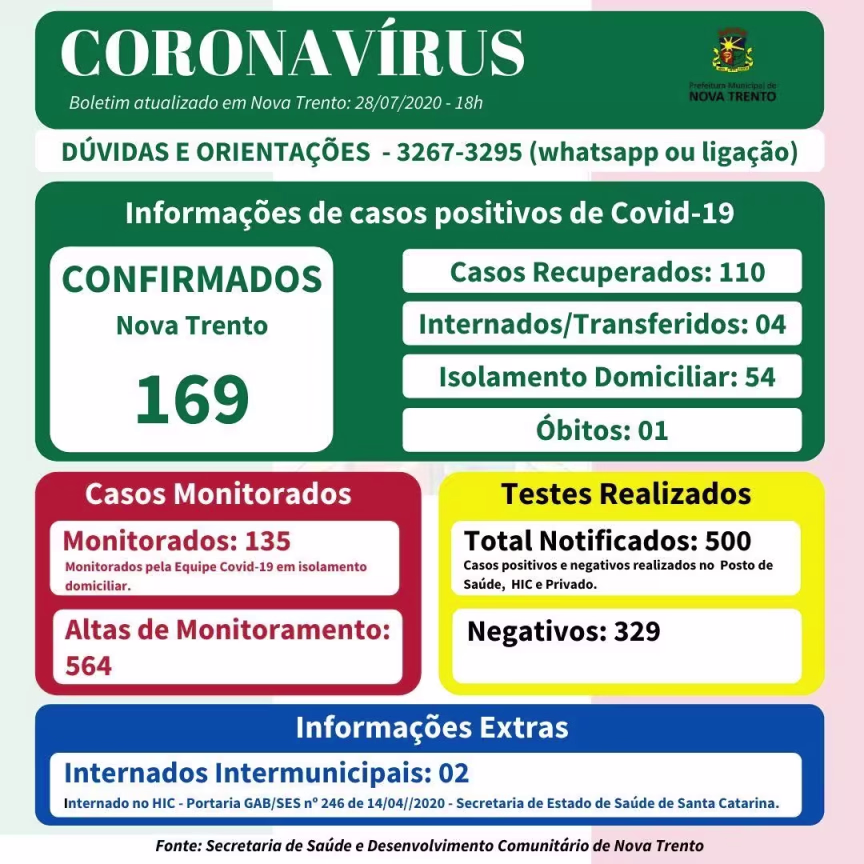 No boletim desta terça o município registrou 11 novos casos de coronavírus, sendo seis mulheres e cinco homens. Agora, Nova Trento soma 169 casos confirmados. Destes, 110 são considerados recuperados.