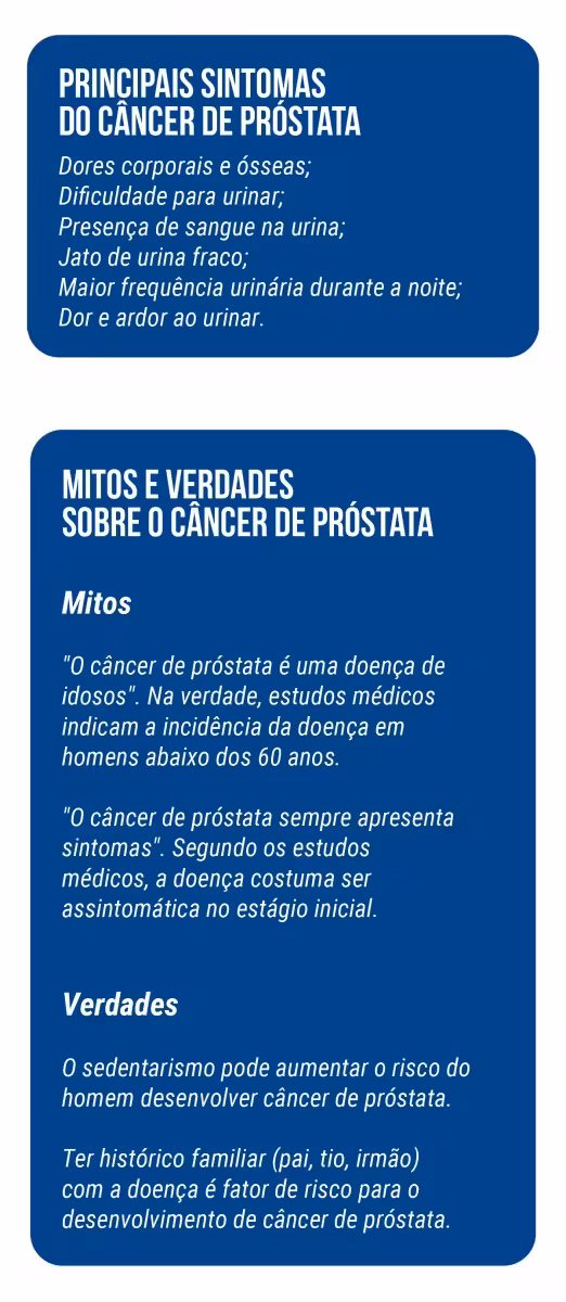 Ainda de acordo com os médicos, o câncer de próstata pode se manifestar, na fase sintomática, com dificuldade ao urinar, cansaço ou emagrecimento sem causa aparente, dores nas costas, entre outros sintomas.