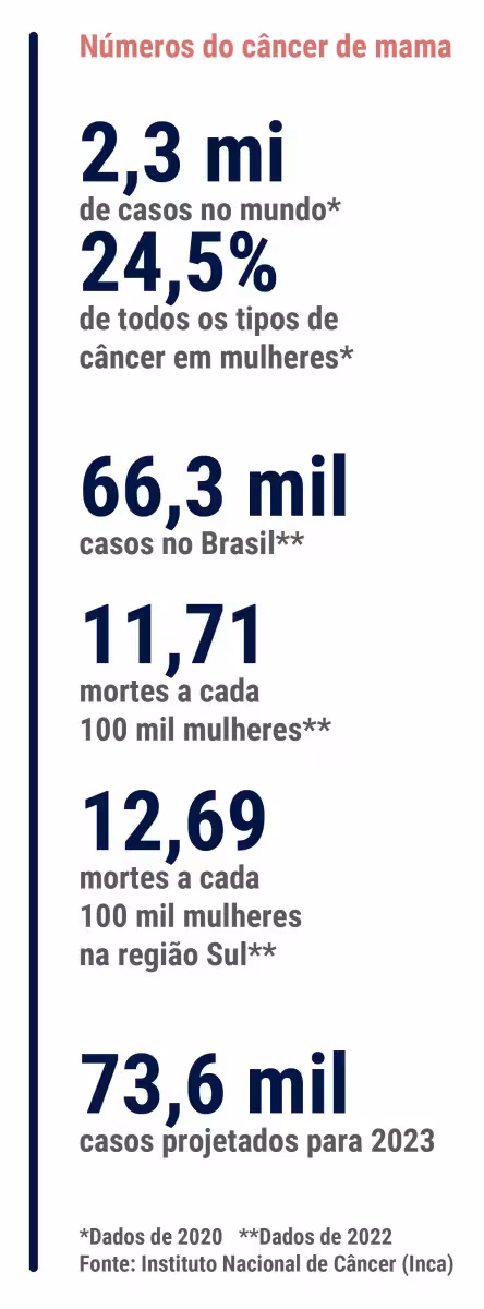 De acordo com o Instituto Nacional de Câncer (Inca), o câncer de mama é o tipo que mais afeta mulheres em todo o mundo. Segundo dados levantados em 2020, são cerca de 2,3 milhões de casos novos foram estimados em todo o mundo, o que representa cerca de 24,5% de todos os tipos de neoplasias diagnosticadas nas mulheres.
