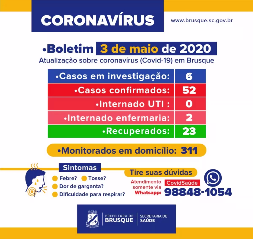 Brusque tem 52 casos confirmados de coronavírus, de acordo com o boletim epidemiológico divulgado neste domingo, 3. São dois casos a mais que o número do boletim divulgado no sábado, 2.