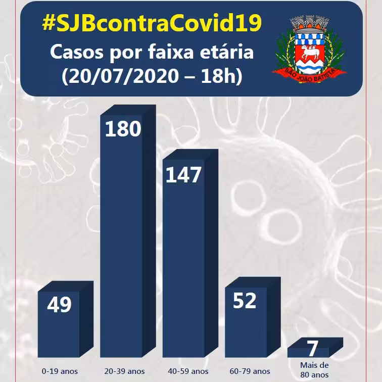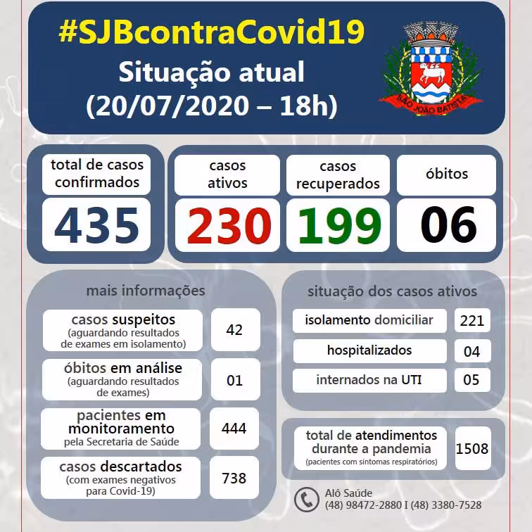 Mais 19 casos da doença foram confirmados no município nesta segunda-feira. São 10 mulheres e nove homens, com idades que variam dos 27 aos 66 anos. Os pacientes residem nos seguintes bairros: Centro – 9, Ribanceira do Sul – 2, Tajuba I – 2, Cardoso – 1, Fernandes – 1, Jardim São Paulo – 1, Krequer – 1, Tajuba II – 1 e Timbezinho – 1. Com isso, a cidade chega a 435 casos confirmados, sendo que 199 são considerados recuperados.
