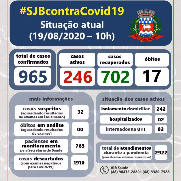 Por outro lado, mais 32 residentes na cidade foram considerados recuperados da doença. Com isso, São João Batista contabiliza, no momento, 246 casos ativos de Covid-19, sendo que dois estão internados em leitos hospitalares de média complexidade e dois seguem na UTI.