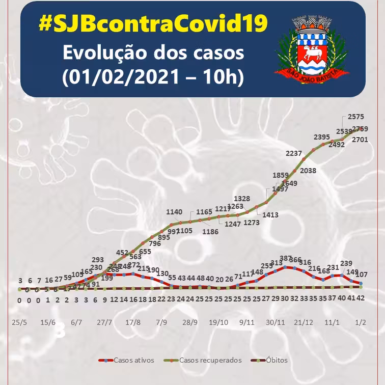 Desde o último boletim, mais quatro batistenses foram considerados recuperados da doença e liberados para o retorno ao convívio social. O município contabiliza, no momento, 107 casos ativos de coronavírus, sendo que dois estão internados em leitos hospitalares de média complexidade e nenhum está na UTI.