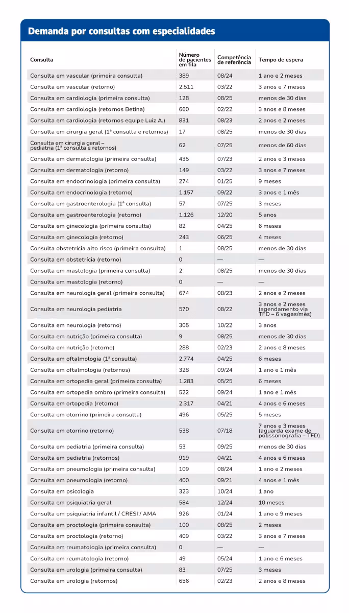 Na categoria de consultas especializadas, a área com maior número de pacientes na fila é a de Oftalmologia, com mais de 2,7 mil pessoas aguardando. Já a consulta com maior tempo de espera é o retorno em Otorrinolaringologia, com sete anos e três meses, de um paciente que aguarda a realização de exame de polissonografia para dar continuidade ao tratamento.
