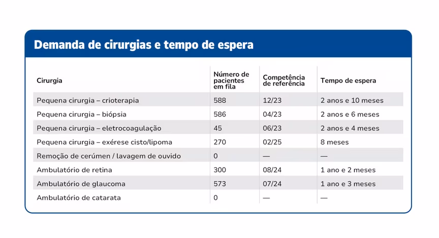No setor de cirurgias, a mais aguardada é a de Crioterapia, com mais de 500 pacientes na fila e tempo médio de espera de dois anos e dez meses.
