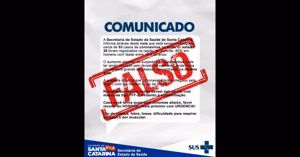 A Secretaria de Estado da Saúde (SES) alerta para a circulação de notícias falsas envolvendo supostos casos do novo coronavírus no Norte de Santa Catarina. A arte veiculada em redes sociais, que alerta para casos na cidade de Joinville, é falsa e utiliza de forma indevida a logomarca do Governo do Estado.
