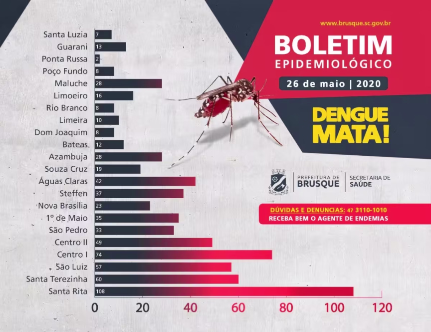 Brusque já soma 36 casos confirmados de dengue. Destes, 20 são autóctones, contraídos dentro do próprio município. Os bairros com maior número de focos do mosquito Aedes aegypti são Santa Rita, com 108 focos; Centro, com 74; e Santa Terezinha, com 60.