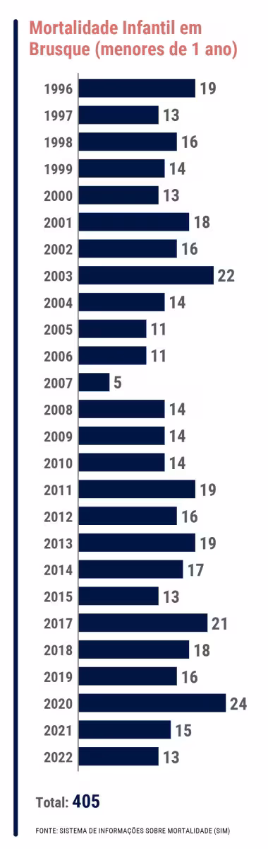 A taxa de mortalidade infantil de bebês de menos de 1 ano está em queda em Brusque desde 2017, com exceção de 2020, ano do auge da pandemia. Em 2022, foram registrados 13 óbitos no município dentro desta faixa etária.