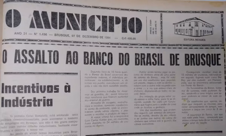 Em dezembro de 1984, O Município noticiou o assalto ao Banco do Brasil de Brusque. Às 16 horas do dia 3 de dezembro de 1984, quatro homens armados invadiram a agência do Banco do Brasil e anunciaram o roubo.
