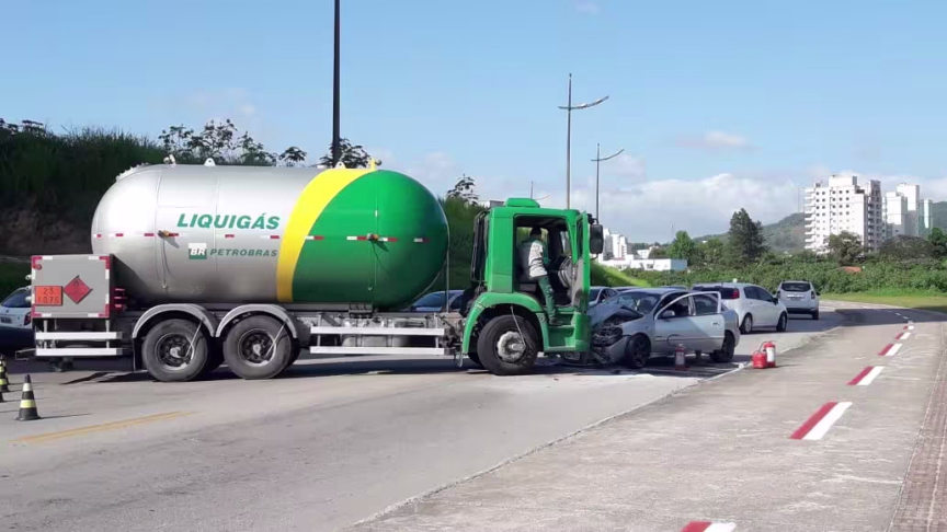 Um caminhão da Liquigás colidiu contra um Astra por volta das 9h desta segunda-feira, 10. O acidente aconteceu na avenida Bepe Roza, a Beira Rio, no Santa Rita, em Brusque.