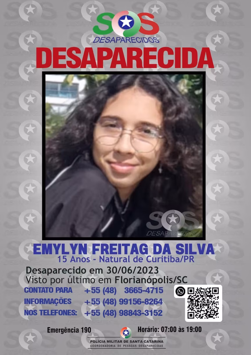Uma adolescente de 15 anos está desaparecida desde a tarde de sexta-feira, 30. Moradora de Florianópolis, Emylyn Freitag saiu de casa para ir para a escola, mas na sexta-feira não apareceu na instituição. Ela também não voltou para casa.
