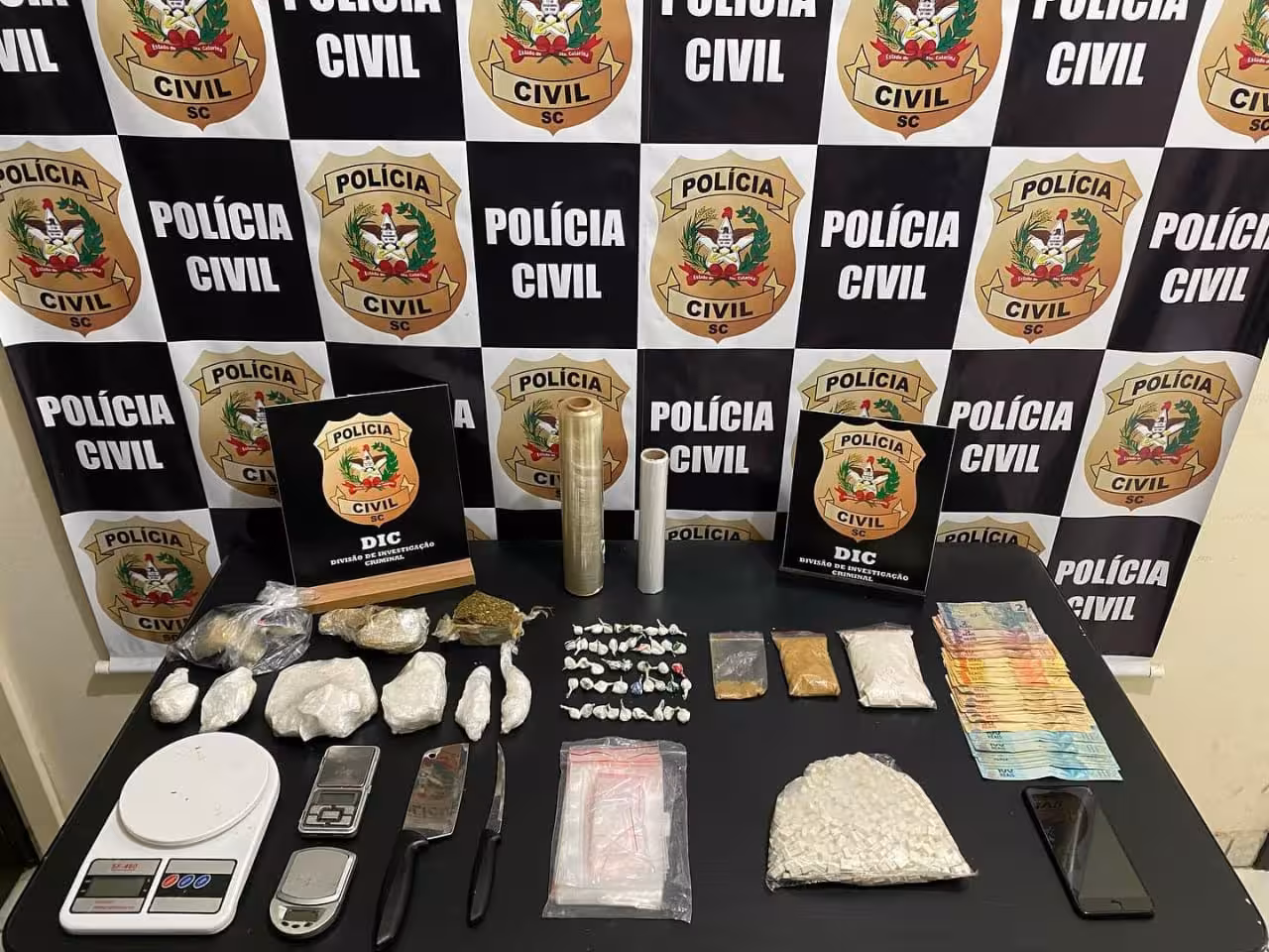 Na residência foram apreendidas porções de drogas, como aproximadamente 1 kg de cocaína, mil comprimidos de ecstasy, 320 gramas de metilenodioximetanfetamina (MDMA), maconha, balanças de precisão, objetos destinados ao preparo das drogas e a quantia de R$ 1.400 em espécie.
