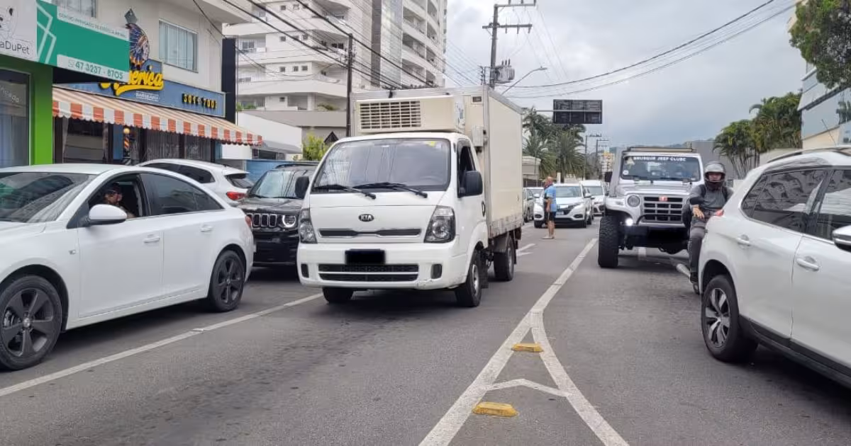 Após pane, caminhão causa transtorno no trânsito de rua do Centro de Brusque