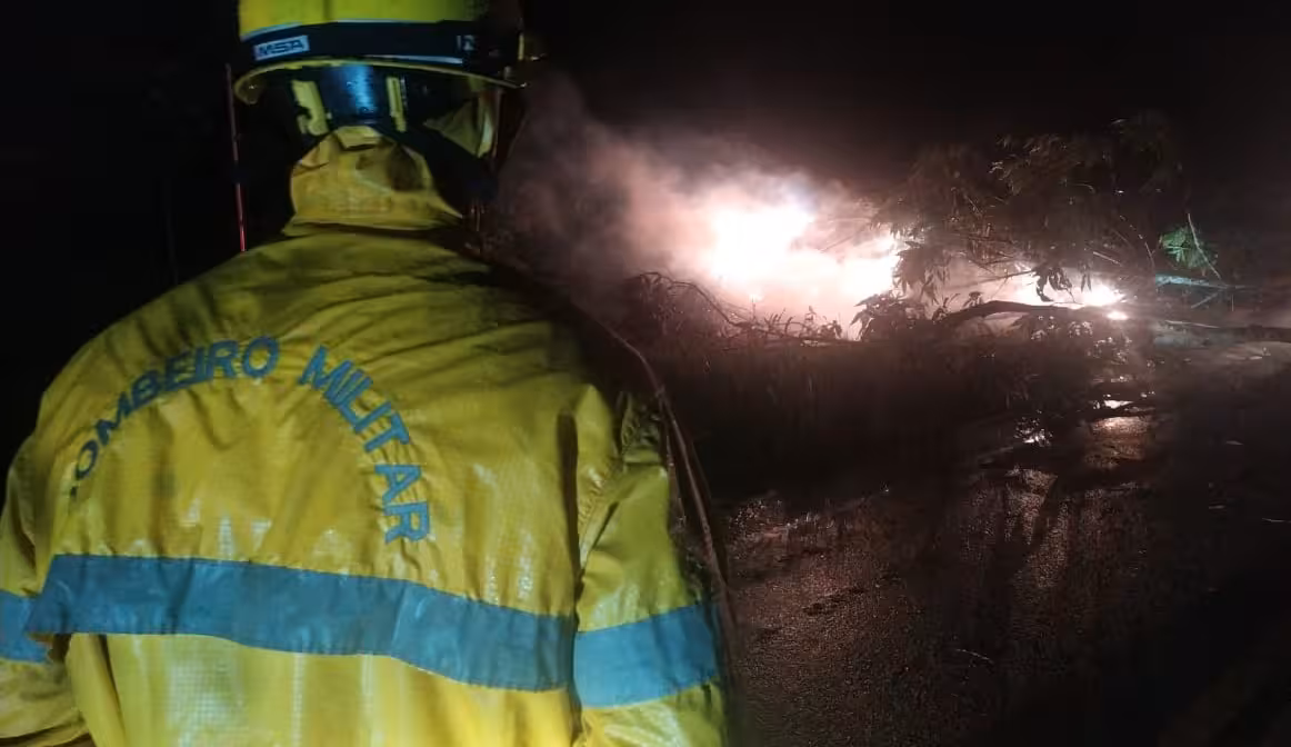 Ao chegarem na rodovia Gentil Batisti Archer, a equipe de socorro constatou a árvore caída na via e nos fios. Com isso, uma equipe da Celesc foi acionada para desligar a energia da rede local.