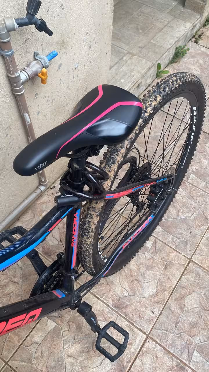 A bicicleta é preta, com detalhes em azul claro e rosa, e está com o cadeado sob o banco.
