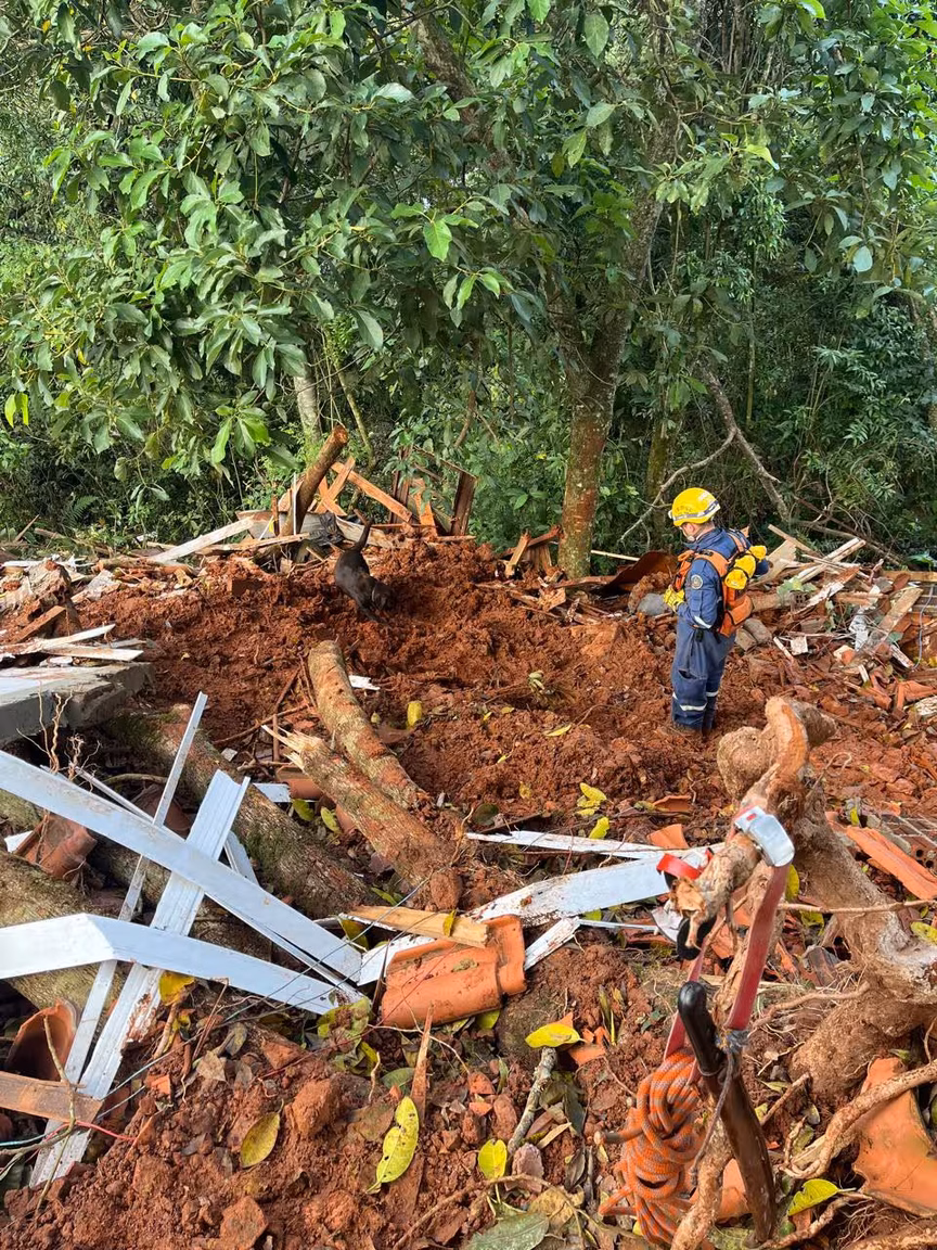 Todo esse trajeto foi feito na companhia dos binômios – dupla formada entre bombeiro e cão de busca – e contou com a ajuda de um grupo de voluntários que está na região prestando apoio às famílias. Com um quadriciclo e um carrinho, eles auxiliaram a equipe em boa parte desse caminho.