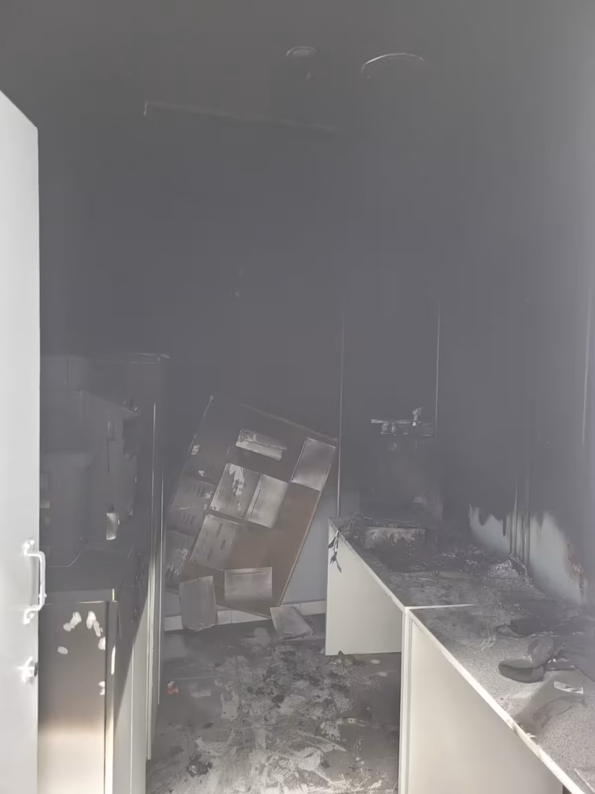 Dois bombeiros entraram no local para localizar o ponto inicial do incêndio, que era uma sala onde um computador entrou em curto circuito se auto extinguindo por falta de oxigênio.