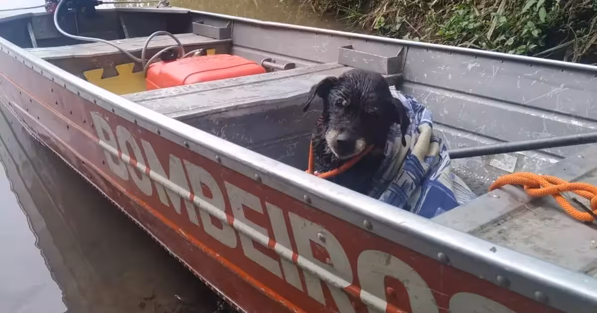 Bombeiros usam lancha para salvar cão às margens de rio no Norte de SC