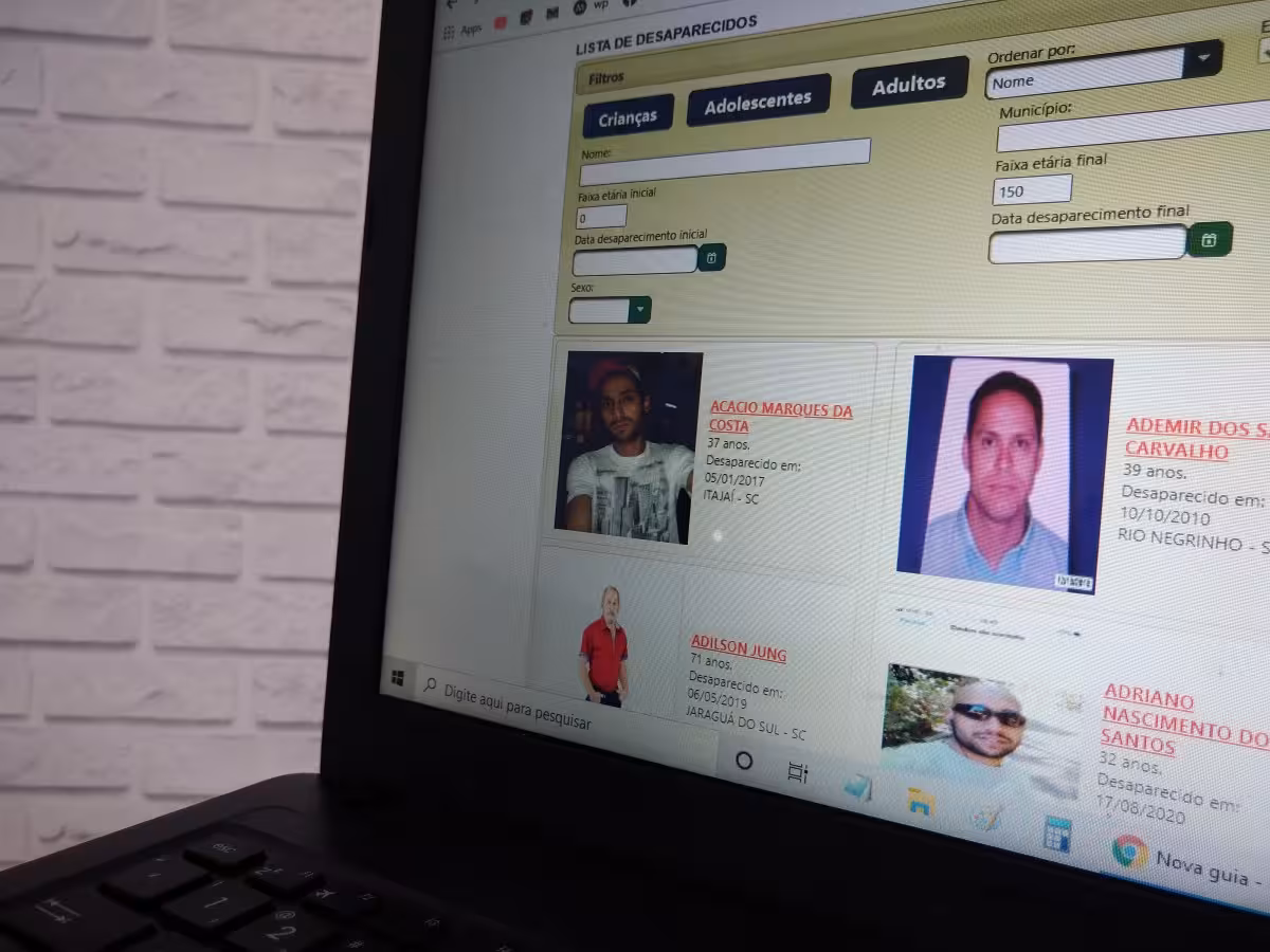 Na página desaparecidos.sc.pc.gov.br, é possível filtrar os dados por cidade. Na maioria dos casos, aparece o nome completo da pessoa, idade e data do desaparecimento.