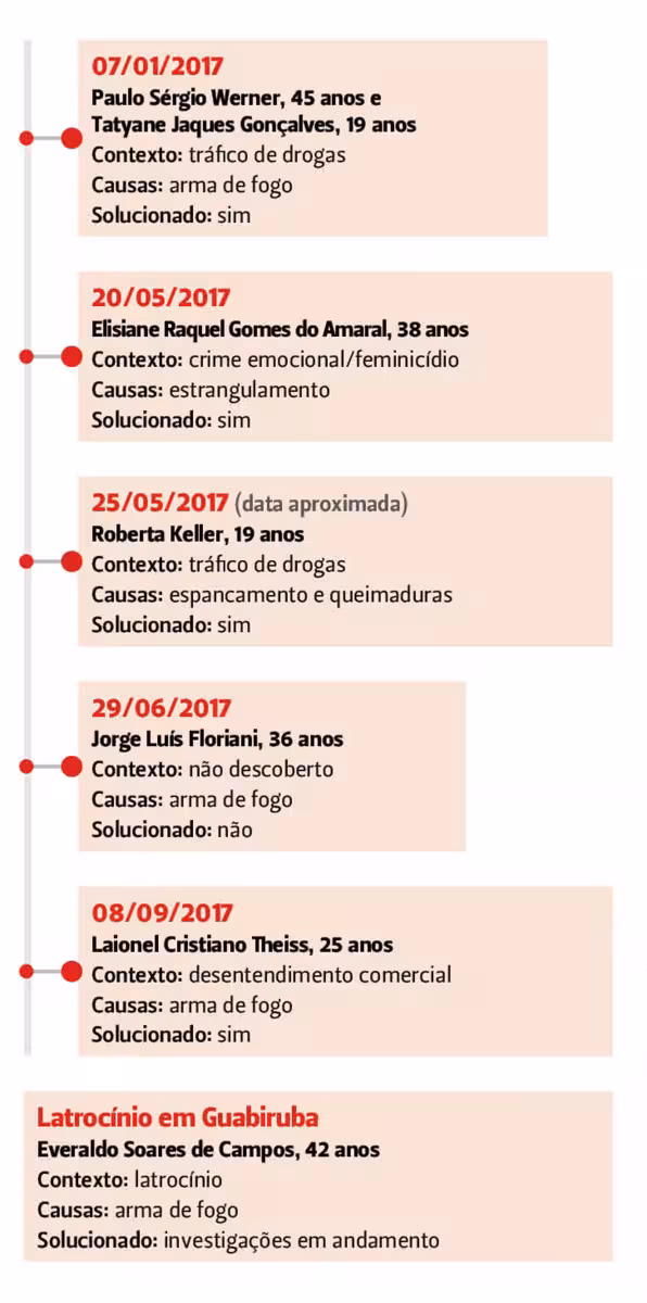 Em 2017, houve também o latrocínio do cabo Everaldo Soares de Campos, de 42 anos, em Guabiruba. Latrocínios são diferentes de homicídios, entra na categoria de crimes contra patrimônio, não contra a vida. Por outro lado, a pena é a partir de 20 anos, enquanto as penas para homicídios são a partir de 10 anos.