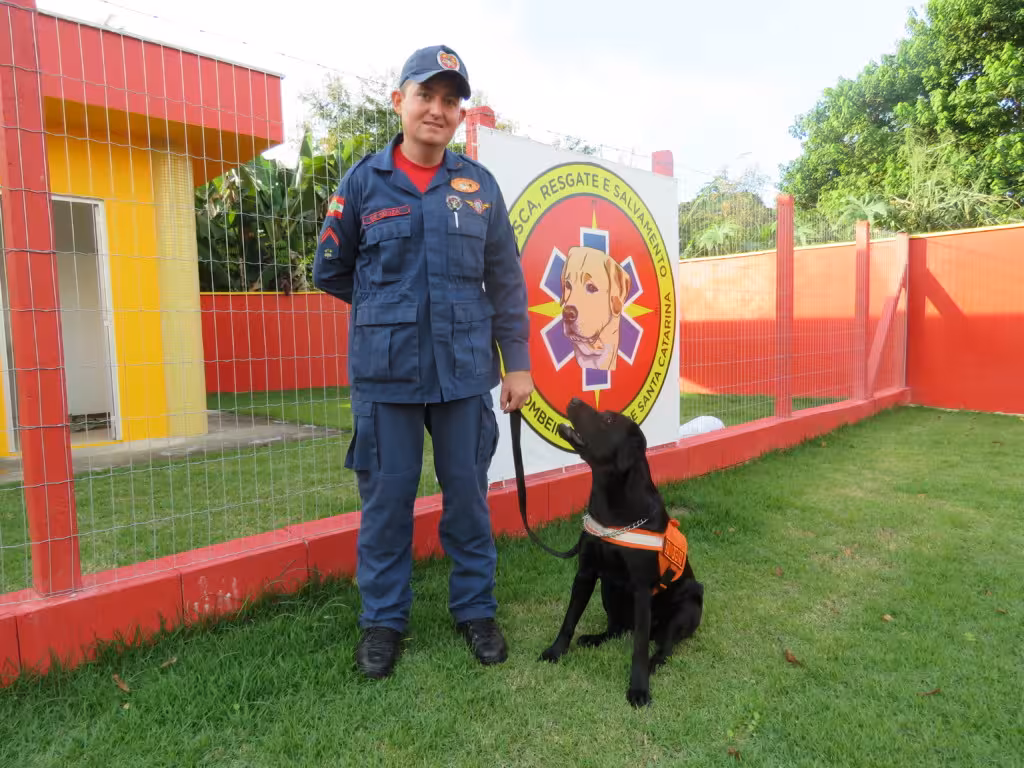Com um ano e meio de idade, completados em 1º de maio, a cadela Zaara, do Corpo de Bombeiros de Brusque, demonstra grande evolução no treinamento para se tornar um cão de busca e resgate. O animal da raça labrador veio para o município com apenas três meses e foi doada ao cabo Carlos Alexandre de Souza, que é o condutor do animal.