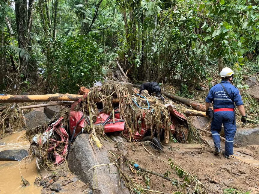 Além deles, o sargento Jacques Romão e o cão Bravo, de Blumenau, também trabalham na ocorrência. Os dois binômios – dupla entre bombeiro militar e cão de busca, têm vasta experiência em atuação em deslizamentos e estiveram em Brumadinho, Petrópolis, Presidente Getúlio, Recife e outras ocorrências locais.