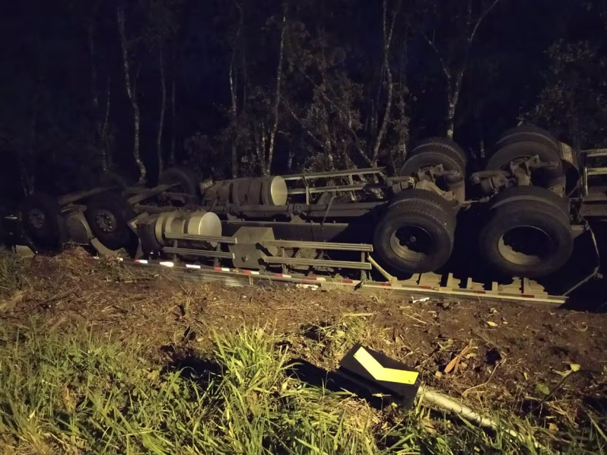 Um caminhão caiu em ribanceira na rodovia Gentil Battisti Archer, no bairro Santa Luzia, em Brusque, por volta das 22h deste domingo, 5.