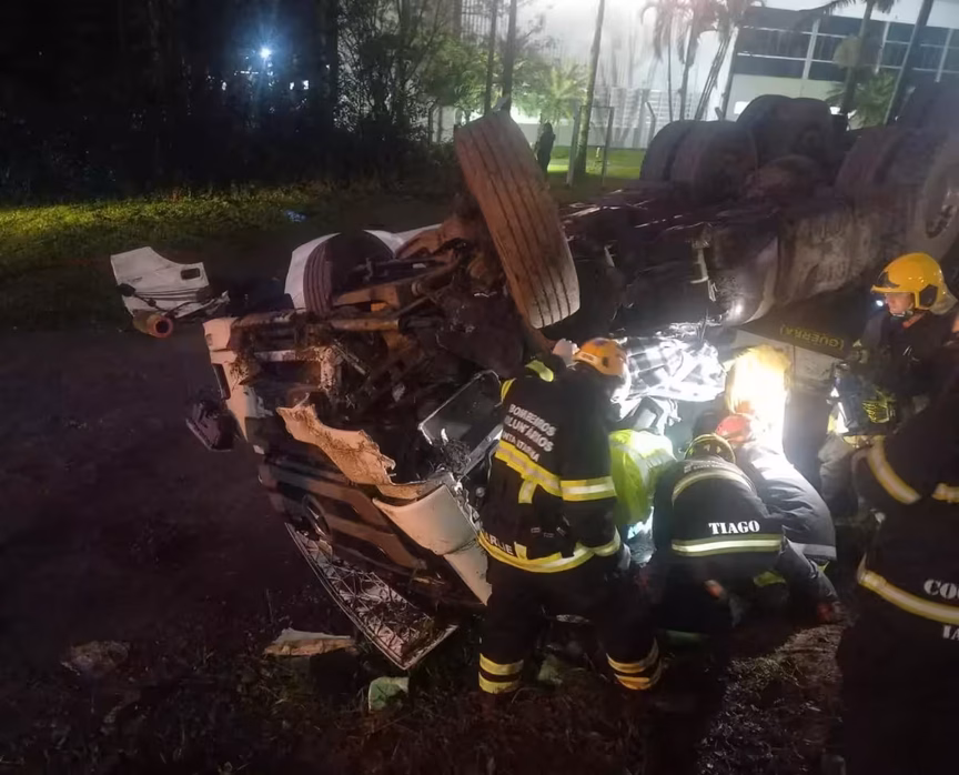 Um motorista ficou gravemente ferido ao capotar uma carreta na BR-101, em Joinville. O acidente aconteceu na madrugada desta quarta-feira, 17.