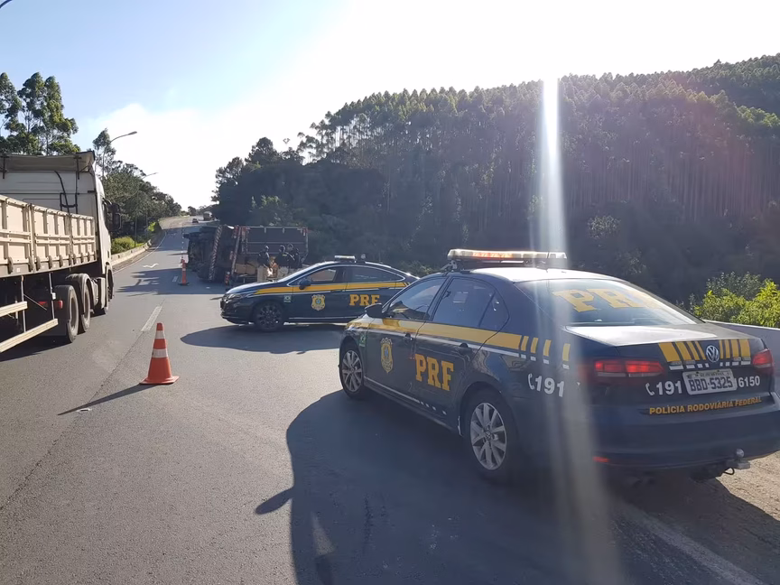 Na manhã desta segunda-feira, 4, um caminhão com placas de Brusque tombou na BR-116, em Campina Grande do Sul, Paraná. O acidente causou a morte de uma mulher que era passageira do veículo.