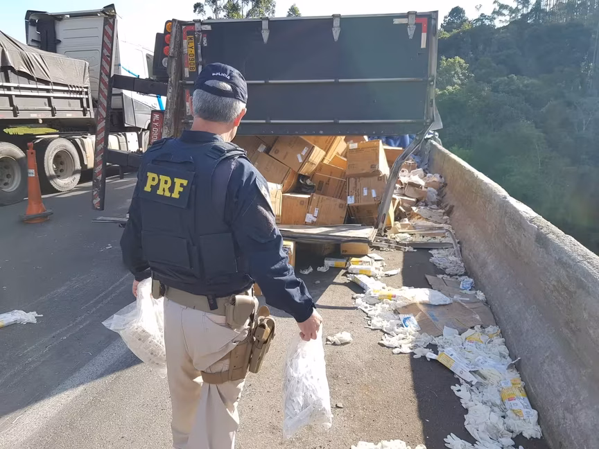 O caminhão transportava produtos hospitalares. Parte da carga foi saqueada antes da chegada dos policiais.