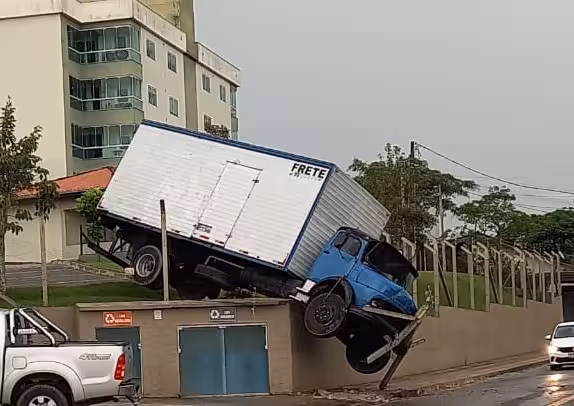 Um caminhão se envolveu em um acidente na tarde desta quarta-feira, 3, em Gaspar. A cena chamou a atenção dos motoristas, que encontraram o veículo pendura no muro de um prédio residencial.