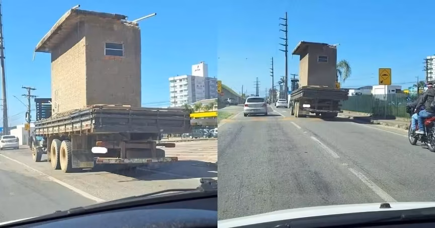 Um caminhão foi flagrado transportando um banheiro de alvenaria na marginal da BR-101, em Tubarão, na tarde desta terça-feira, 13. A construção estava amarrada por apenas alguns fios de arame e representava um grande risco.