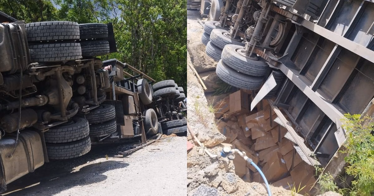 Trabalhadores de uma empresa próxima relataram que o motorista entrou na área para realizar a entrega de insumos, mas foi informado de que estava na empresa errada. Ao tentar retornar de ré, o caminhão acabou tombando na beira do rio, possivelmente devido à falta de iluminação no local no período da noite.