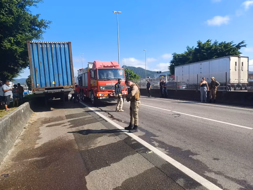 Caminhão pega fogo e interdita trecho da BR-101, em Balneário Camboriú