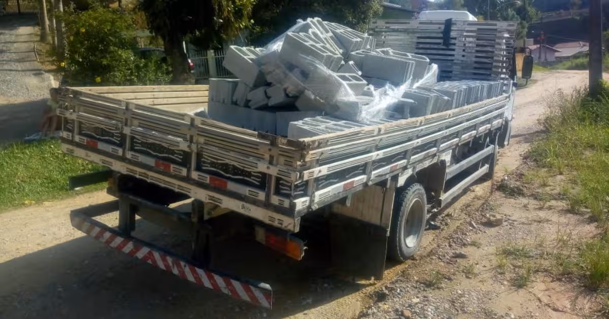 Um caminhão foi flagrado transportando uma carga sem estar devidamente presa na rua Luiz Maffezzolli, bairro Limeira, nesta terça-feira, 1. Caminhão também não apresentava placa traseira.