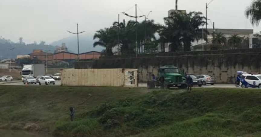 Carga de caminhão tomba na avenida Beira Rio, no Centro de Brusque