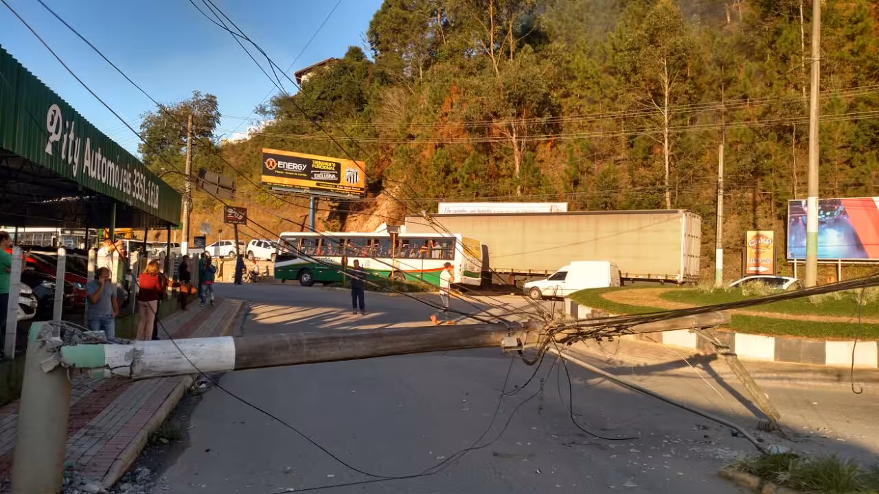 Com a queda, a carga elétrica da fiação atingiu o matagal em um morro, em frente à rotatória e causou um incêndio.