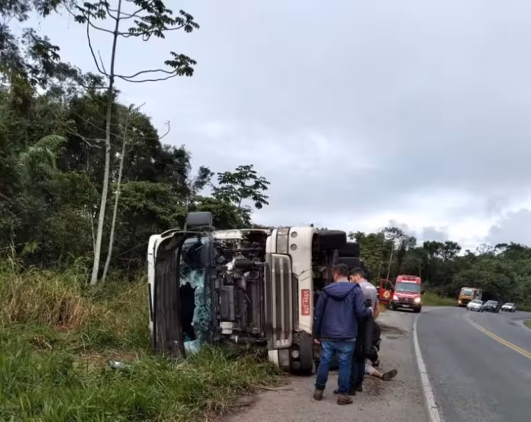 Carreta com carga de carne tomba na BR-470, em Rodeio