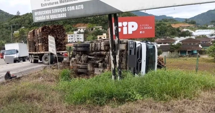 Uma carreta com carga de madeira tombou na rodovia Gentil Battisti Archer, em Brusque, na manhã desta segunda-feira, 15. O acidente aconteceu por volta das 8h50, no bairro Zantão.