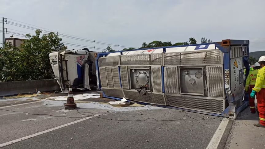 Carreta tomba e derrama produto químico na BR-101; trecho foi interditado