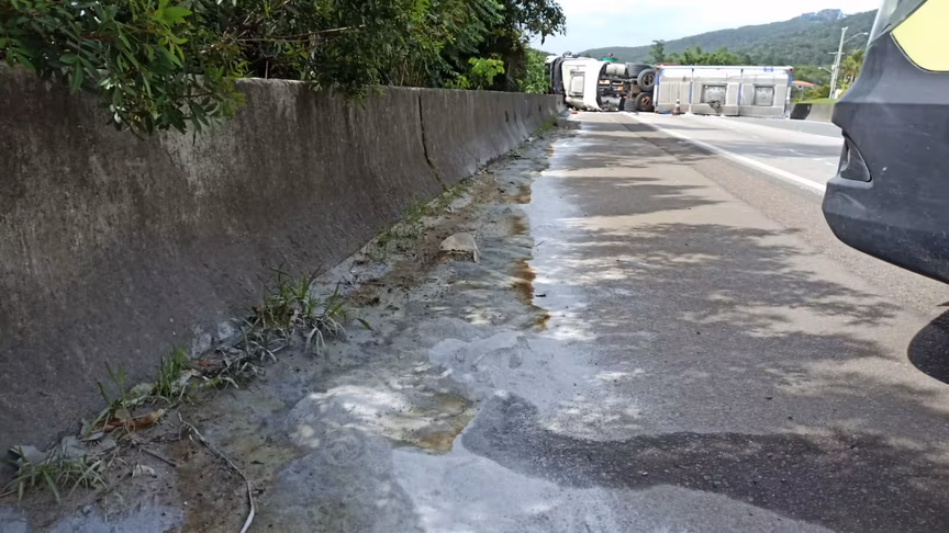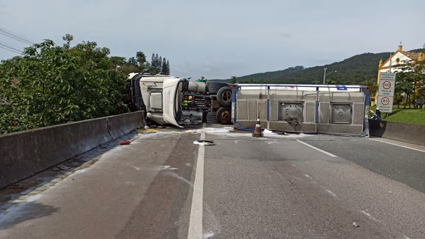 Uma carreta que transportava produto químico tombou e interditou um trecho da BR-101, em Biguaçu, na Grande Florianópolis, na madrugada desta segunda-feira, 20. O acidente aconteceu no quilômetro 188.